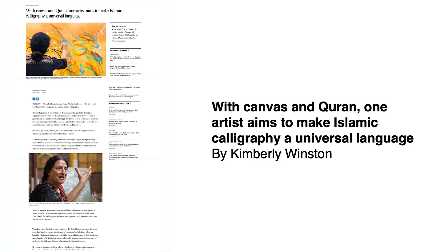 Yeah, so what happened when I did my masters from India, I was doing abstract work, but nature only, you know, it was movements of nature I was doing. I didn't know anything about Islam. I didn't know anything about Quran, I didn't know anything about calligraphy. So when I went to Middle East, I love this calligraphic the continuous line, you know, I used to copy it. And there was one quote from one Islamic scholar who said that the calligraphy starts from the field of action, it starts on right, you know. So it starts from the field of action, and lands in the field of heart. So, it was so beautiful, and I think it stayed with me. And then I started learning Arabic slowly, because, you know, I was curious, what do they say? So then I started making the sense of those words, and I was amazed at this line, how it's making the meaning also. But before I went deeper into the meanings of Quran, this line became my language. And when I came to USA, I continued with those abstract figures and you know, my lines, but then 2001, when this 9/11 happened, after that, I got a jolt, you know, like, it was something, people started asking me because I was known as a Muslim artist, you know, so they would ask me, Is Islam like that? Do you believe in that? So I said, No, my God is same. My God hasn't changed. So he is not Muslim. He is not Hindu. He is not Christian. So he is not like that. It cannot be like that. So there's some, something wrong gone somewhere. So I started learning Quran.