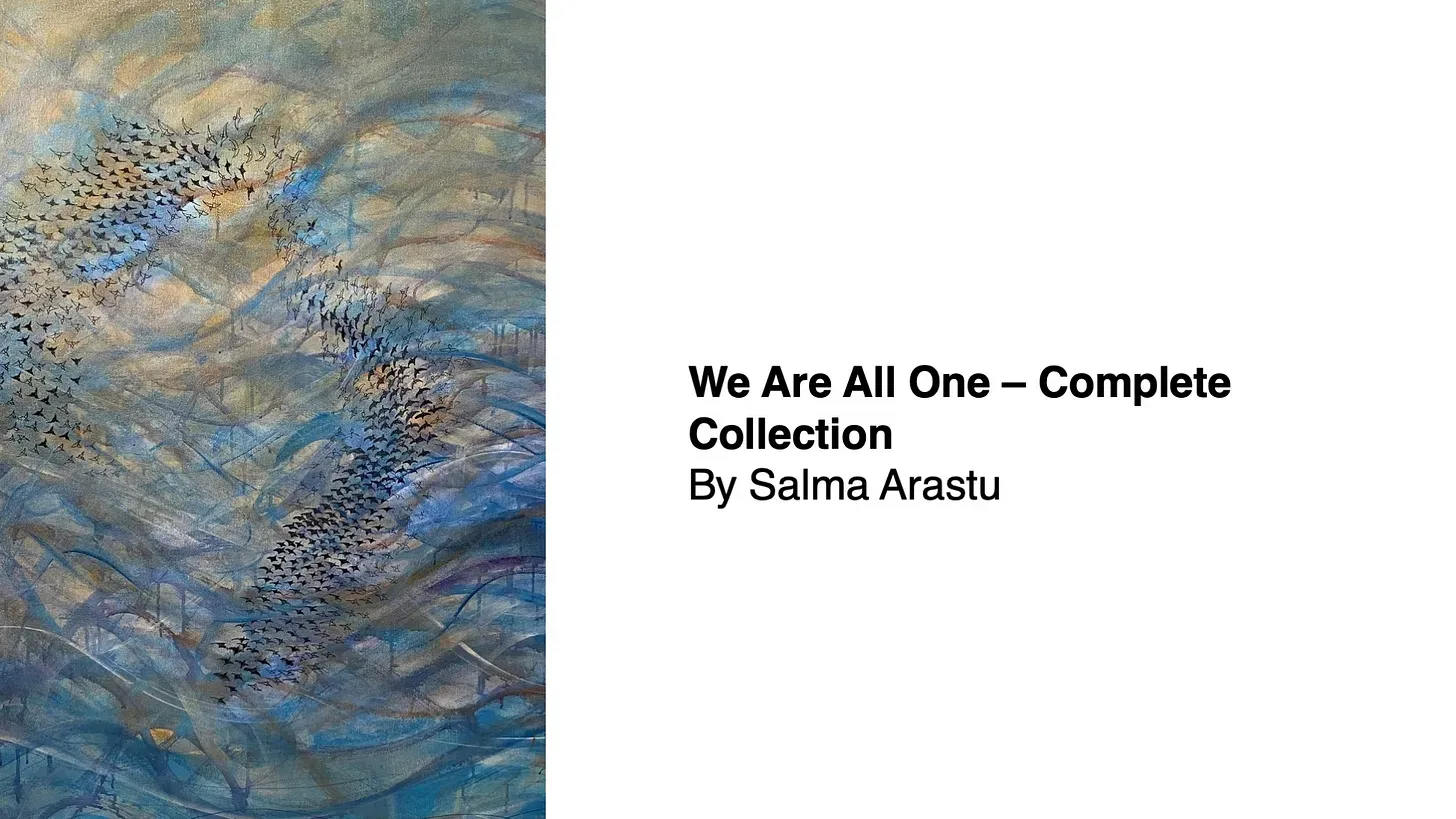 Yes, I believe in oneness. And these are kind of my oneness projects, you know, like, I want to bring the whole humanity together. And in my work, initially, they were abstract figures, you know, that they are coming together in groups, you know, celebrating together, sharing together, chanting together. So this has been my theme always. And from that, you know, gradually, as I was looking around the nature, I live on the bay in this area. And so nature has been great friend, I would say, you know, I keep watching the plants, the water, the clouds every morning. So this has been part of my daily schedule that I look at the nature and absorb it and go to my studio. And so somehow the nature, the the birds, the animals, and the plants, they all got into my work, and I realized we are all one, we are all breathing, we are all connected. So I think gradually I started doing work, which showed all living beings in my work, and I call it We Are All One.