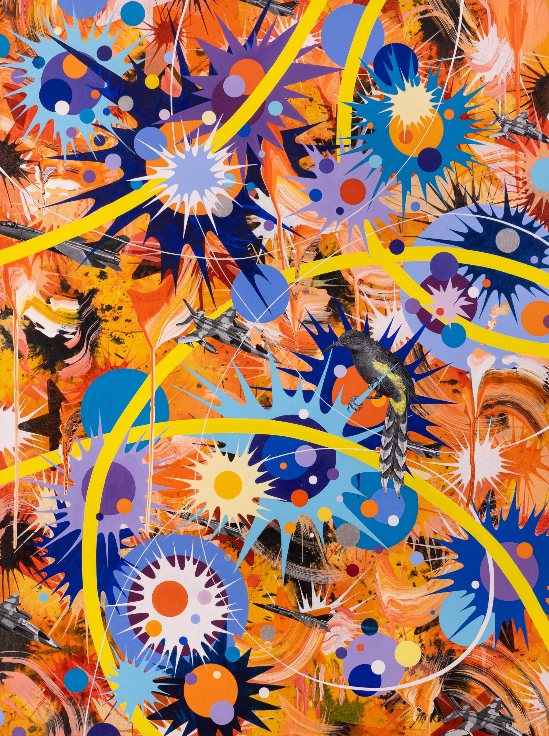 Kara Maria’s paintings take a very different approach to representing animals. Her work features extinct, endangered, and invasive species, but they all float in abstract worlds, popping with color and soaked in the impact of humans on their lives.