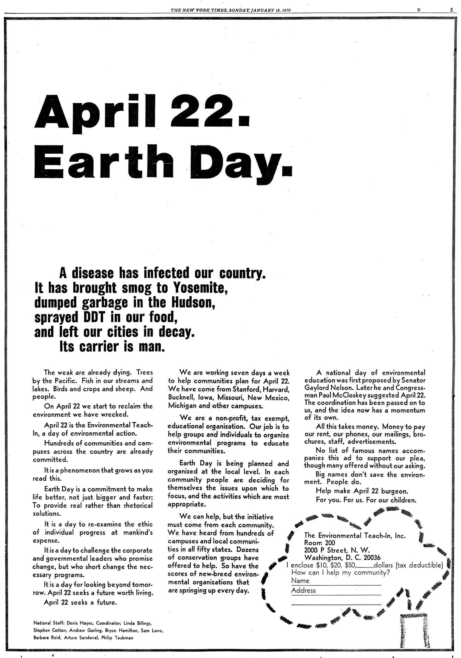 The first Earth Day, on April 22, 1970, was something totally different. With 12,000 events across the country and more than 35,000 speakers from every walk of life—young and old, scientists and preachers, liberals and conservatives—the transformative power of the first Earth Day, conceived as a teach-in rather than a rally or a protest, is hard for us to imagine in our contemporary era of stark political polarization, hashtag protests, and climate denial politics.