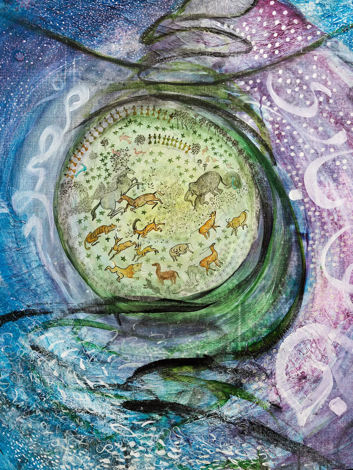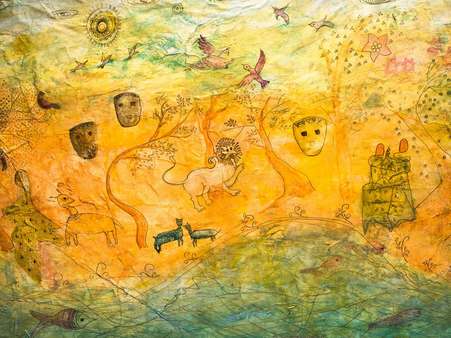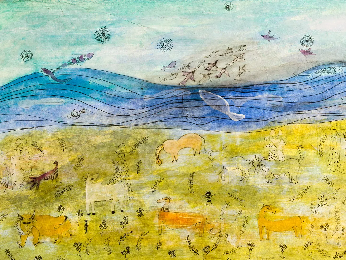 The canvasses in Salma Arastu’s series of paintings, We Are All One, are full of soft colors, continuous lines, immersive habitats that flow into one another, and—sometimes—two-dimensional representations of humans and animals occupying the same space, echoing cave paintings.