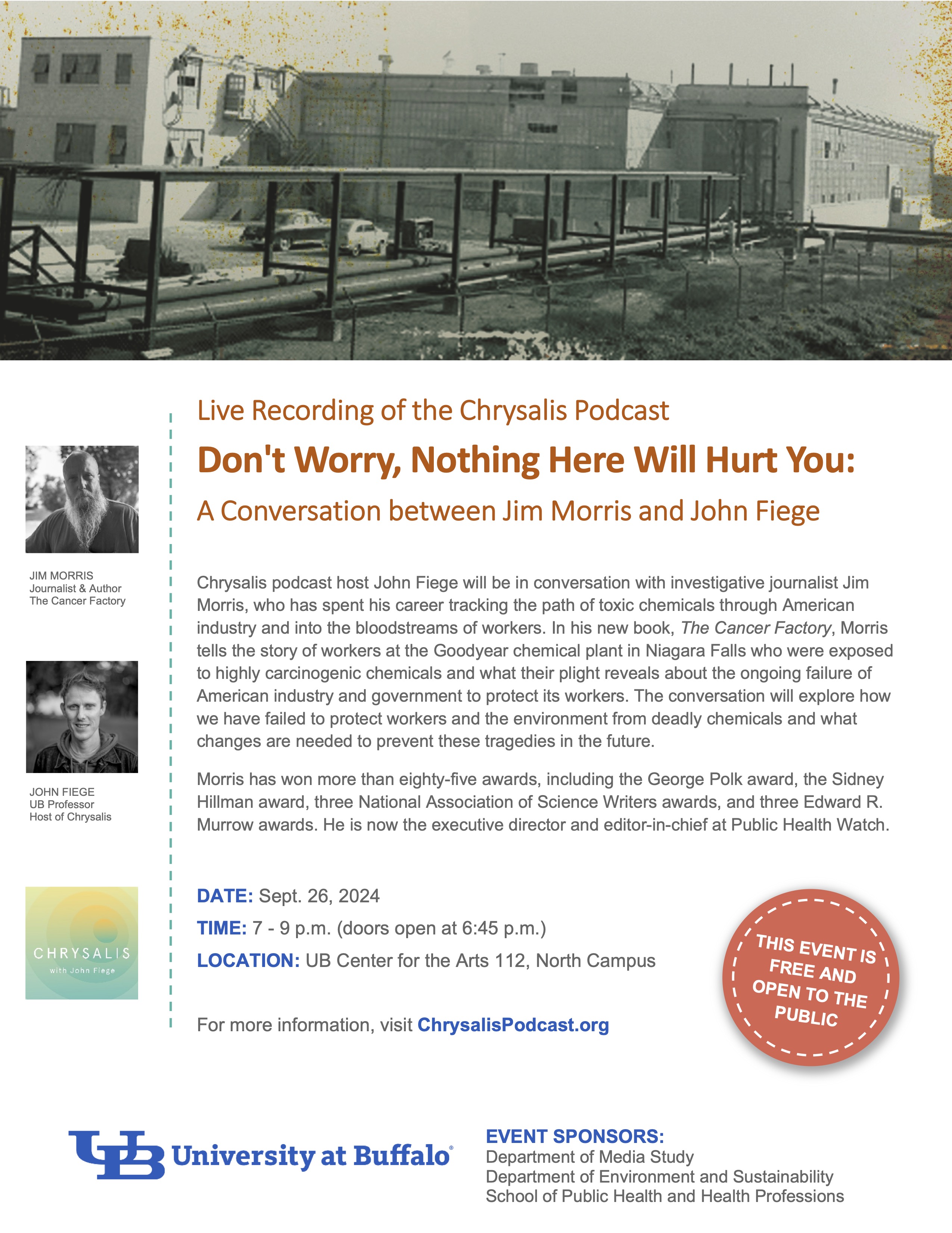 Come check out a live recording of the Chrysalis podcast next Thursday, September 26, 2024, at the University at Buffalo. I will be in conversation with Jim Morris, who just published a powerful book about a cancer cluster among workers at the Goodyear chemical plant in Niagara Falls and how the chemical industry has evaded regulations and responsibility for decades—and how they continue to endanger workers and the public.