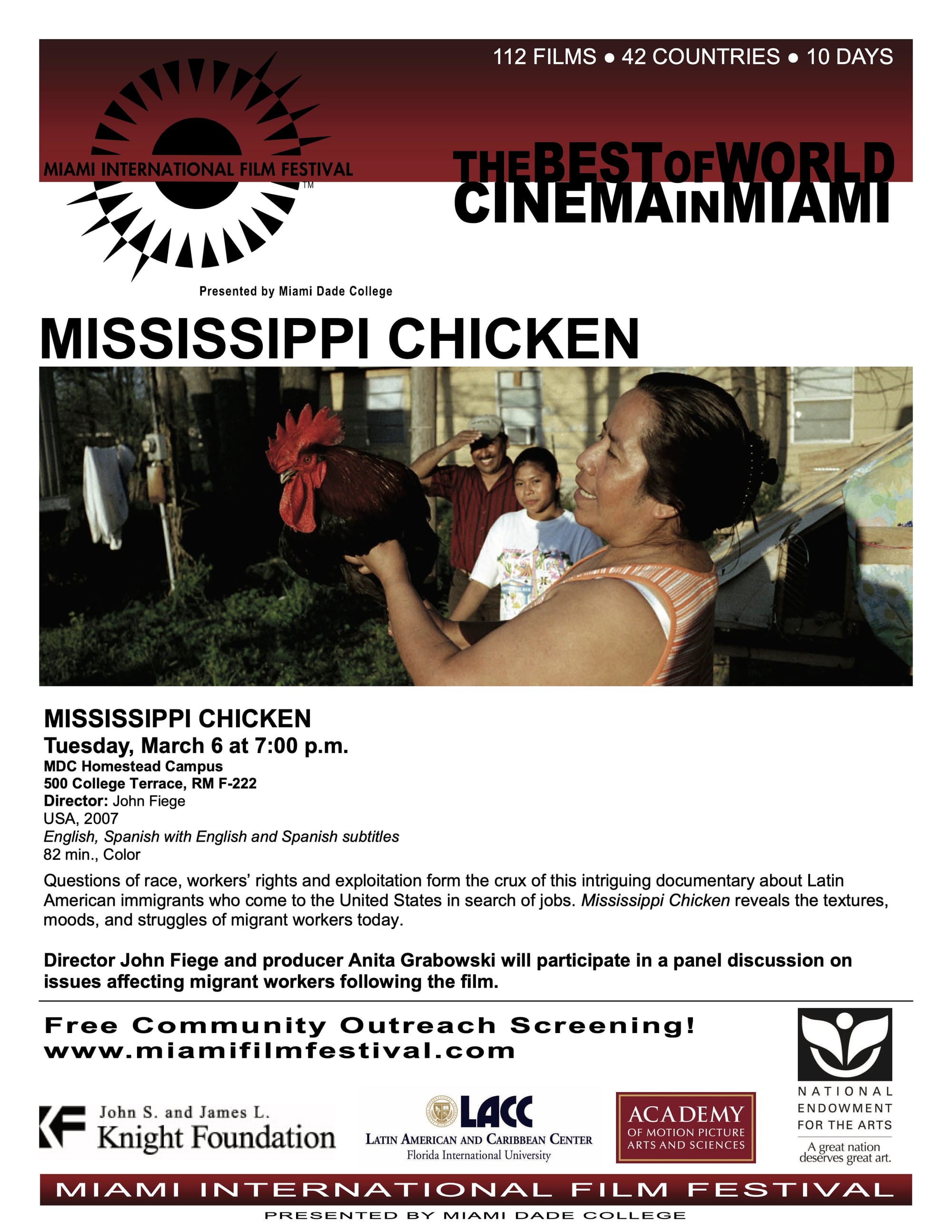 “A scathing documentary about the plight of immigrant laborers recruited to the South to work in poultry factories, this film is what Linklater's ‘Fast Food Nation’ could have been, had it stuck more to the format of the book on which it was based…A powerful indictment of the plight of migrant workers, ‘Mississippi Chicken' is a wrenching look at what it's like at the bottom of the labor food chain. Shot on 8mm, the film has a gorgeous, saturated, old home-movie look that brings the heat of the southern summer to life on the screen.” - Kim Voynar, IndieWire